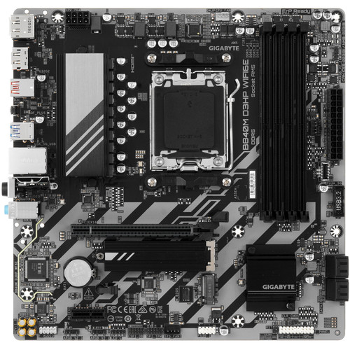Материнская плата GIGABYTE B840M D3HP WIFI6E в форм-факторе Micro-ATX с размерами 244x244 мм подходит для сборки аппаратной платформы в компактном системном блоке ПК. Она поддерживает совместную работу с процессором AMD, который подключается через сокет AM5. Для модулей оперативной памяти суммарным объемом до 256 ГБ предусмотрены 4 слота DIMM стандарта DDR5. Графическую дискретную видеокарту можно разместить при помощи слотов PCI-E x16. Установка накопителей HDD/SSD реализована благодаря 4 разъемам SATA и 2 M.2.