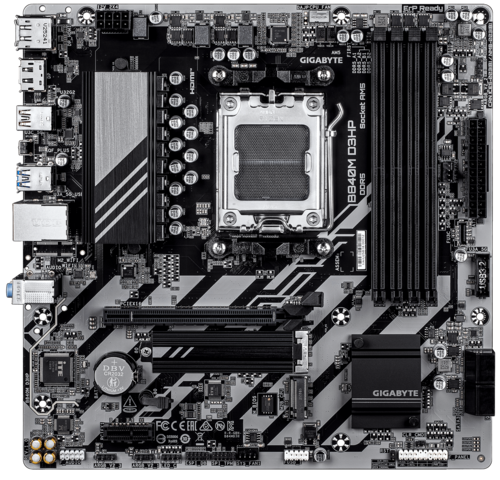 Материнская плата GIGABYTE B840M D3HP в форм-факторе Micro-ATX с размерами 244x244 мм подходит для сборки аппаратной платформы в компактном системном блоке ПК. Она поддерживает совместную работу с процессором AMD, который подключается через сокет AM5. Для модулей оперативной памяти суммарным объемом до 256 ГБ предусмотрены 4 слота DIMM стандарта DDR5. Графическую дискретную видеокарту можно разместить при помощи слотов PCI-E x16. Установка накопителей HDD/SSD реализована благодаря 4 разъемам SATA и 2 M.2.
