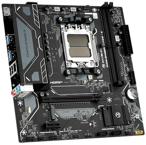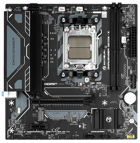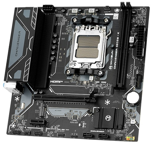 Материнская плата MaxSun Challenger B850M-K в форм-факторе Micro-ATX с размерами 225х220 мм подходит для сборки аппаратной платформы в компактном системном блоке ПК. Она поддерживает совместную работу с процессором AMD, который подключается через сокет AM5. Для модулей оперативной памяти суммарным объемом до 96 ГБ предусмотрены 2 слота DIMM стандарта DDR5. Графическую дискретную видеокарту можно разместить при помощи слота PCI-E x16. Установка накопителей HDD/SSD реализована благодаря 2 разъемам SATA и 1 M.2.