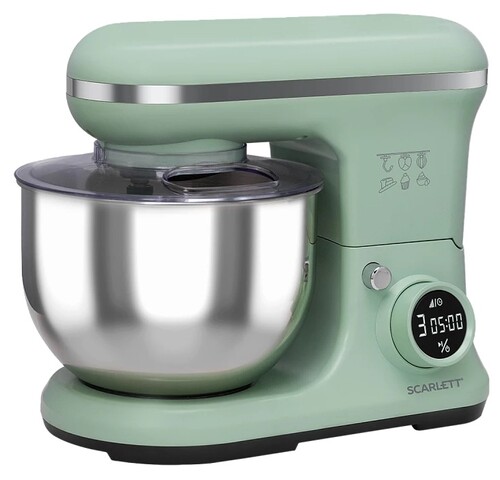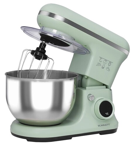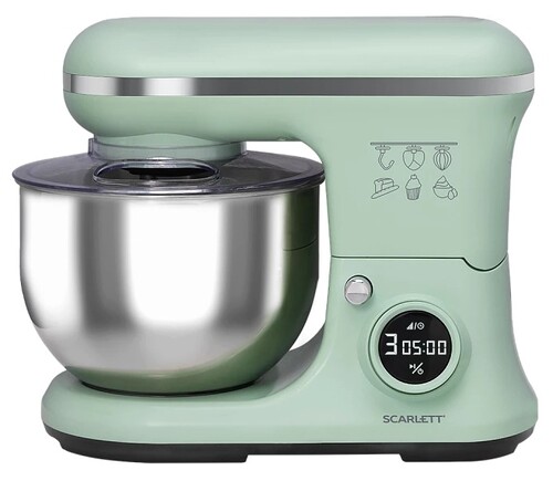 Планетарный миксер SC-SM10S55 мощностью 1400 Вт – незаменимый помощник на кухне! 8 скоростей и функция установки таймера позволят подобрать оптимальный режим для приготовления различных блюд. Стильный салатовый цвет прибора, металлическая декорация и сенсорная панель управления отлично впишутся в интерьер любой кухни. В комплект входит крюк для замешивания густого теста, венчик для взбивания белков, лопатка для смешивания, а также чаша объемом 5.2л. Венчик и чаша миксера выполнены из нержавеющей стали, что делает их пригодными для мытья в посудомоечной машине. Крышка с отверстием для добавления ингредиентов поможет сохранить рабочую поверхность в чистоте, а нескользящее основание обеспечит устойчивость прибора в работе с продуктами любой консистенции. По истечению заданному времени на таймере прибор автоматически выключится, что делает работу прибора наиболее удобной. Металлические шестеренки, которые обеспечивают работу важнейших элементов, защита мотора от перегрева и перегрузки, а также защита от включения с открытой чашей сделают эксплуатацию прибора эффективной и безопасной.