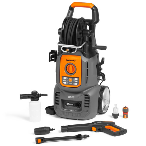 Мойка высокого давления Daewoo DAW 675. Пистолет с системой REMOTE CONTROL. Кнопочный регулятор ступеней давления позволяет не просто отслеживать выбранный режим, а выбирать его непосредственно на пистолете с помощью кнопок. Система смены режимов работы. Три режима работы, позволяют подобрать параметры под любую задачу. Первый режим, низких оборотов двигателя (мягкий), для работ с деликатными поверхностями, таких как заборы, сайдинг. Второй режим, средних оборотов двигателя (средний), для мойки садового и спортивного инвентаря. Третий режим, максимальных оборотов двигателя (жёсткий), для мойки машин, садовых дорожек, цоколя. Мощный, надёжный и производительный электродвигатель DAEWOO. Электрический двигатель с медной обмоткой имеет высокий ресурс работы и выдает максимальную мощность 2600 Вт и увеличенный крутящий момент для стабильной работы мойки. Надежная алюминиевая помпа, выдаёт максимальное давление 200 бар при производительности 620 литров в час, что позволяет справляться даже с трудными загрязнениями. Улучшенное охлаждение – гарантия долгого срока службы и надежной работы. Все детали пистолета, находящиеся в непосредственном контакте с водой, выполнены из нержавеющей стали, устойчивой к перепадам давления и температуры. Система Quick Connect позволяет быстро установить пеногенаратор для нанесения пены без использования дополнительных инструментов В комплект поставки входит уникальная четырехпозиционная моющая насадка. Помимо трех веерных режимов, она имеет функцию грязевой фрезы и подходит для широкого круга работ - от деликатной мойки до отбивания старой засохшей грязи. Переключение режимов осуществляется вращением насадки. Широкая заливная горловина пеногенератора позволяет легко заполнить емкость необходимым количеством моющего средства не пролив его. Также пеногенератор позволяет регулировать плотность пены и направление её нанесения. Барабан для шланга позволяет аккуратно хранить 12 метров шланга. Облегчает размотку шланга, до необходимой длины. Шланг высокого давления аккуратно наматывается на барабан, благодаря направляющей. Телескопическая ручка позволяет с лёгкостью транспортировать аппарат. Со сложенной рукояткой занимает мало места. Большие колёса облегчают передвижение по неровностям. Сетчатый отсек для мелочей, позволяет хранить фильтр тонкой очистки и грязевую фрезу. Формованный крюк на корпусе, позволяет аккуратно хранить шнур питания. Армированный шланг высокого давления длиной 12 м имеет запас прочности, значительно превосходящий мощность насоса. Создан на основании технологий и сочетает в себе гибкость без перегибов с возможностью работать под высоким давлением. Внешний грязеотталкивающий слой позволит быстро очистить шланг. Система защиты от высокого входного давления воды. Система защиты от низкого входного давления воды. Система защиты от перегрева. Система TOTAL STOP. Система автоматики включает и останавливает электродвигатель, когда начинается или прекращается расход воды. Данная система продлевает срок службы помпы и всех узлов, находящихся под высоким давлением.