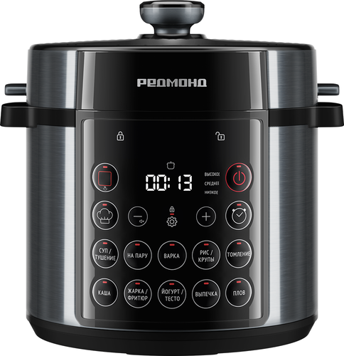 Мультиварка-скороварка РЕДМОНД MP113 синего цвета с 5-литровой чашей из алюминия поддерживает 10 программ – варка, выпечка, жарка/фритюр, йогурт/тесто, каша, на пару, плов, рис/крупы, суп/тушение и томление. Пользователю устройства доступны таймер и режим отложенного старта. Мощность мультиварки – 1000 Вт.
