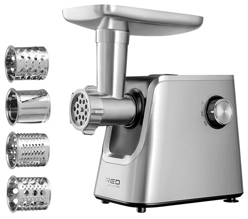 RED SOLUTION MG128-6 — это мясорубка с функцией овощерезки с мощностью 2000 Вт. Компактное устройство весом в 3,3 кг отличается высокой производительностью – за одну минуту мясорубка может выдать до 2 кг качественного фарша. С этой моделью вы также можете быстро обработать овощи – нашинковать капусту и морковь для щей, нарезать лук для котлет или натереть картофель для драников. Внутри мясорубки установлен планетарный редуктор, который отвечает за эффективность работы устройства и его долгий срок службы.