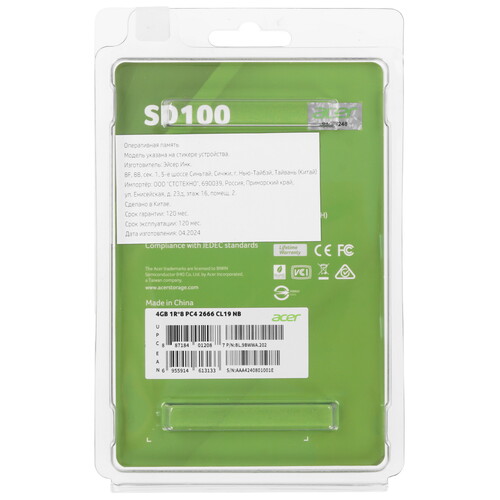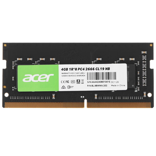 Оперативная память SODIMM Acer SD100 [BL.9BWWA.202] 4 ГБ является компонентом для ноутбука и устанавливается в слот для ОЗУ. Модуль с емкостью 4096 МБ поддерживает работу с тактовой частотой 2666 МГц. Он поддерживает режим разгона Plug-and-Play и автоматически разгоняется до максимальной частоты, поддерживаемой BIOS системы. Пропускная способность планки – PC21300. Изделие позволит увеличить быстродействие офисного ноутбука при установке в свободный разъем для памяти SODIMM DDR4. Его также можно установить вместо другой планки с более низкими характеристиками. Модуль оперативной памяти Acer SD100 [BL.9BWWA.202] выполняется в виде платы из черного текстолита с 8 чипами памяти. Чипы в этой модели размещаются на обеих сторонах печатной платы. Планка предполагает стабильную работу при уровне напряжения 1.2 В на входе.