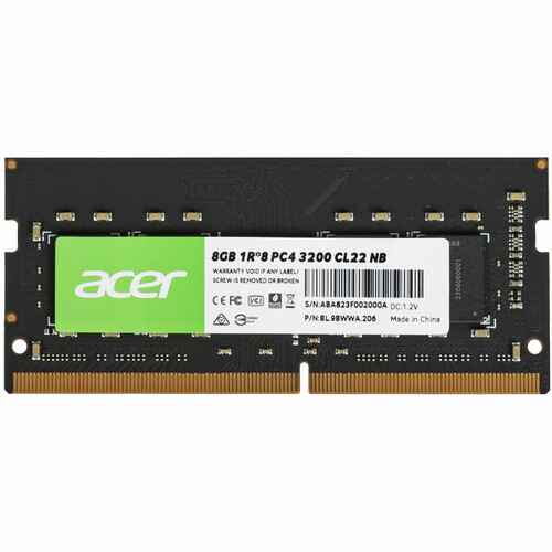 Оперативная память SODIMM Acer SD100 [BL.9BWWA.206] 8 ГБ относится к стандарту DDR4 и поддерживает установку в ноутбук или неттоп для дома или работы. DDR4. В комплекте представлена одиночная планка емкостью 8 ГБ, рассчитанная на тактовую частоту до 3200 МГц. При установке в ноутбук модуль поддерживает автоматическое увеличение частоты до максимальной, поддерживаемой системой. Память демонстрирует пропускную способность PC25600 и задержки 22-22-22-52. Конструктивно планка ОЗУ Acer SD100 [BL.9BWWA.206] выполняется в виде черной печатной платы с 8 чипами памяти по обеим сторонам. Аксессуар можно подключить к свободному слоту ОЗУ ноутбука или смонтировать вместо другого модуля с меньшими характеристиками, добившись увеличения быстродействия компьютера. Планка предполагает работу при напряжении питания 1.2 В на входе.