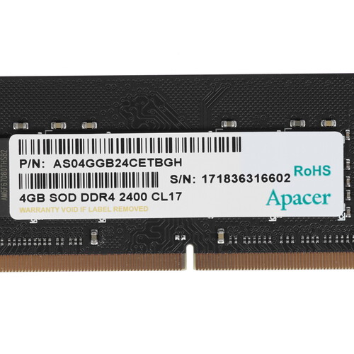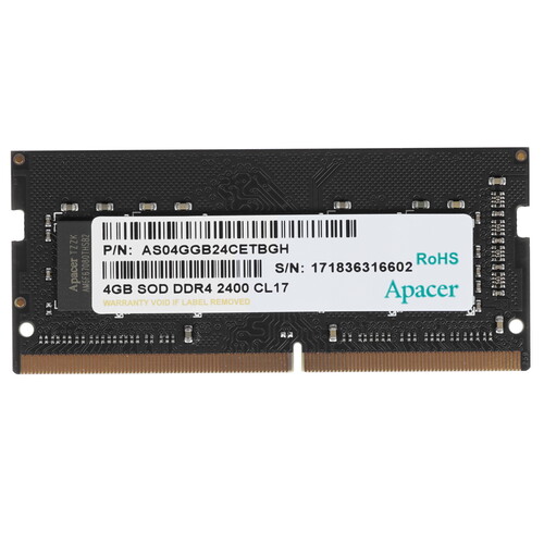 Оперативная память SODIMM Apacer [ES.04G2T.KFH] – надежное устройство, предназначенное для использования в составе портативных компьютеров. Память соответствует самому распространенному в настоящее время типу – DDR4. Объем модуля равен 4 ГБ. Память такого объема широко используется при модернизации ноутбуков. Частота оперативной памяти SODIMM Apacer [ES.04G2T.KFH] составляет 2400 МГц. Пропускная способность устройства – 19200 МБ/с. Модуль соответствует показателю CAS-латентности 17. Напряжение питания памяти составляет 1.2 В. При производстве модуля была применена двусторонняя компоновка чипов. Количество чипов равно восьми. Высочайший уровень качества производства модуля способствует безопасности и простоте установки. Устройство рассчитано на длительную работу, в течение всего срока эксплуатации мобильного компьютера. Роль упаковки модуля памяти играет компактная коробка, имеющая «окно», сквозь которое можно ознакомиться с внешним видом устройства.