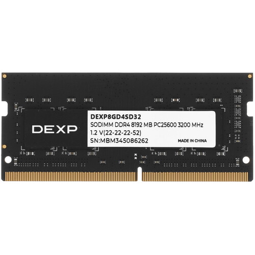 8-гигабайтная оперативная память SODIMM DEXP [DEXP8GD4SD32] – оснащение для мобильных компьютеров с поддержкой стандарта DDR4. Модуль также подходит для сборки и модернизации некоторых компактных стационарных ПК. Необходимое условие совместимости с материнской платой – соответствие слотов ОЗУ типоразмеру SODIMM. Оперативная память SODIMM DEXP [DEXP8GD4SD32] рассчитана на использование частоты 3200 МГц. Пропускная способность устройства – 25600 МБ/с. Показатель достаточен для продуктивной работы с офисными пакетами, редакторами фото и видео, интернет-браузерами, архиваторами, антивирусами и другим типовым программным обеспечением. Тайминги модуля – 22-22-22-52. Его совместимость расширена поддержкой частот от 1600 МГц. Напряжение питания памяти – 1.2 В. Это стандартный показатель для DDR4: он гарантирует низкое энергопотребление и минимальное тепловыделение модуля. Память не подвержена избыточному нагреву при любых нагрузках в играх и рабочих задачах.