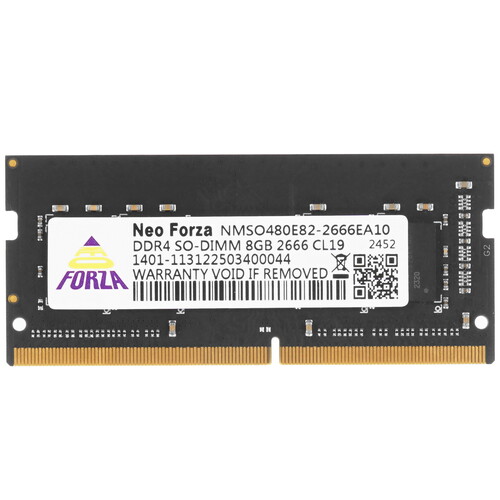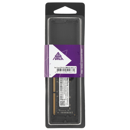 Оперативная память SODIMM Neo Forza [NMSO480E82-2666EA10] 8 ГБ соответствует форм-фактору SODIMM DDR4 и поддерживает применение в ноутбуке или компактном системном блоке ПК. Одиночная планка демонстрирует емкость 8192 МБ и поддерживает работу при тактовой частоте до 2666 МГц. Собранное на основе платы из черного текстолита изделие получает 8 чипов памяти, расположенных на обеих сторонах платы. ОЗУ с пропускной способность PC21300 имеет тайминги 19-19-19. Рекомендованное для работы оперативной памяти комплекта Neo Forza [NMSO480E82-2666EA10] входящее напряжение – 1.2 В. Модуль может стать средством модернизации ноутбука или неттопа, производительность которого вы хотели бы увеличить. Планка подключается в свободный слот на материнской плате или монтируется вместо модуля, характеристики которого ниже.