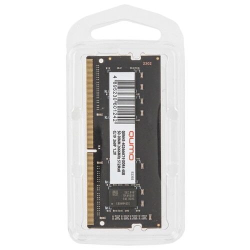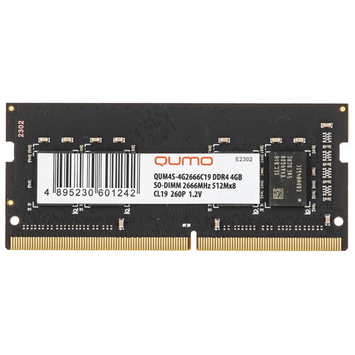 Оперативная память SODIMM QUMO [QUM4S-4G2666C19] 4 ГБ соответствует стандарту DDR4 и предполагает использование в компактном компьютере-неттопе или ноутбуке. Компонент позволит вам нарастить быстродействие ноутбука и обеспечить его продуктивную работу при одновременном выполнении нескольких задач. Модуль отличается емкостью 4096 МБ и пропускной способностью PC21300. Он рассчитан на работу с тактовой частотой до 2666 МГц. Модуль ОЗУ QUMO [QUM4S-4G2666C19] собирается на основе темно-зеленой печатной платы и оснащается 8 чипами памяти. Он предполагает работу при уровне входного напряжения 1.2 В. В комплект входит одна планка, которую можно установить в свободный слот для ОЗУ или смонтировать вместо другого модуля, характеристики которого вас не устраивают.