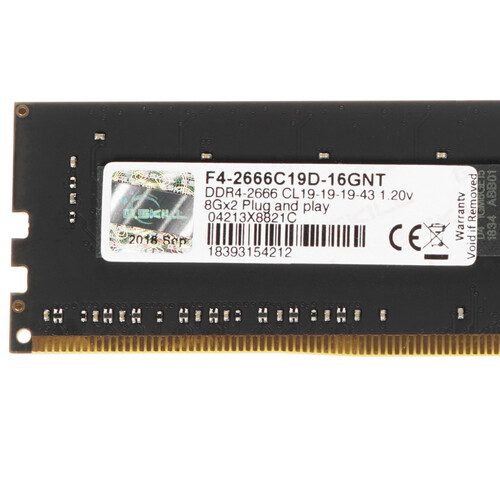 Оперативная память G.Skill [F4-2666C19D-16GNT] может с успехом использоваться при сборке или модернизации универсальных домашних компьютеров или рабочих станций офисного класса. В 16-гигабайтный комплект входят два 8-гигабайтных модуля DDR4. Модули идеально совместимы между собой, поэтому у вас гарантированно не возникнет сложностей в процессе эксплуатации компьютера. При необходимости вы сможете увеличить количество комплектов G.Skill [F4-2666C19D-16GNT]. Тактовая частота памяти равна 2666 МГц. Пропускная способность равна 21300 МБ/с. Тайминги модулей – 19-19-19-43. Для питания памяти используется стандартное для DDR4 напряжение – 1.2 В. Высота модулей равна 31.2 мм. Это типовая величина для памяти, конструкцией которой не предусмотрен радиатор. В качестве упаковки комплекта памяти был использован оригинальный блистер. Конструкция упаковки позволяет ознакомиться с дизайном модулей без распаковки.