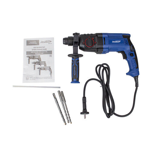 Перфоратор REDBO RHD-24/950 работает в режимах долбления, обычного и сверления с ударом. Инструмент с патроном SDS-plus совместим с разными типами оснастки. Есть функция Vario-Lock для поворота зубила в нужном направлении без запуска устройства. Реверс помогает мгновенно переключаться между режимами влево/вправо для изъятия застрявшего патрона. Ограничитель глубины сверления не позволяет случайно просверлить тонкую стену насквозь.