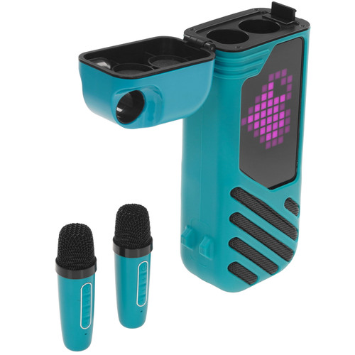 К колонке B52 Karaoke Box в комплекте идет 2 микрофона. Фишка в их хранении! Два мини-микрофона удобно хранятся внутри колонки - не потеряются и не сломаются. Больше никаких дополнительных мешочков или подставок. Микрофоны в колонке не заряжаются, только хранятся. Мини караоке-колонка Karaoke box имеет компактный размер: 225*80*48см. Можно удобно брать ее с собой куда угодно: на дачу, в поездку, даже на прогулку. Она легко поместится в сумку. Особенность этой модели в пиксельном дисплее. На него выведены забавные картинки, которые можно менять нажатием на кнопки корпуса. Внутри караоке системы с микрофонами динамик мощностью 10 Вт. Без зарядки колонка работает до 9 часов. Есть Bluetooth, а также возможность использования TF-карт. Такая система станет идеальным подарком для тех, кто любит петь, веселиться и брать настроение с собой! Можно уверенно использовать ее как детское караоке.