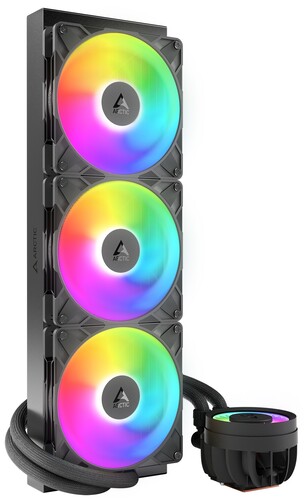 ARCTIC Liquid Freezer III 420 A-RGB Black — это трёхсекционная система жидкостного охлаждения процессора, отличающаяся высокой эффективностью и тишиной своей работы. Отличительными особенностями системы являются 38-мм радиатор, охлаждающая поверхность которого была увеличена на 23% путем увеличения плотности рёбер, и мощный 60-мм VRM-вентилятор, способный значительно понизить температуру зоны VRM на материнской плате. Данная модель оснащена тремя фирменными 140-мм P-вентиляторами с A-RGB Gen.2, обеспечивающими очень высокое статическое давление воздуха.