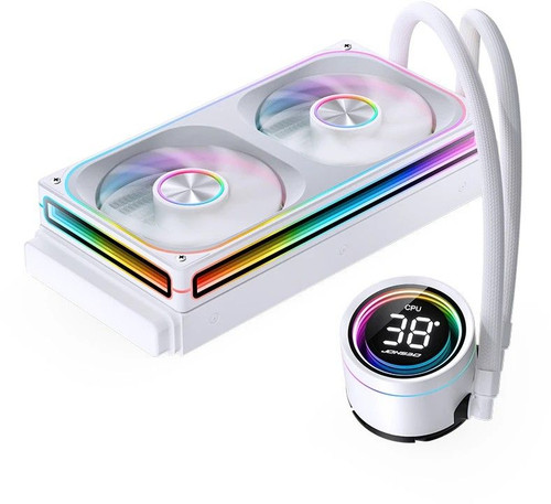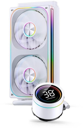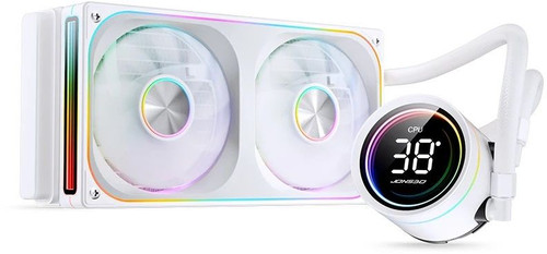 JONSBO TH-240 White — это система жидкостного охлаждения (СЖО) типа «все в одном» (AIO) с радиатором 240 мм, ориентированная на эстетичную сборку и эффективный отвод тепла до 260 Вт (TDP). Встроенный LED-экран в реальном времени отображает температуру процессора.