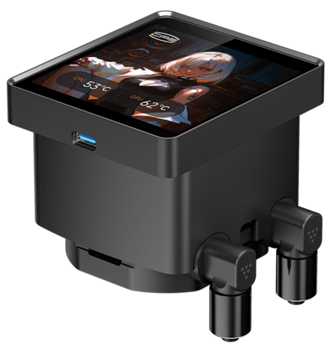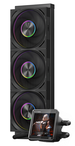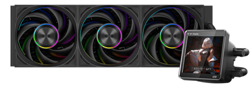 Система охлаждения PCCooler DT360 ARGB представлена в черном цвете. Особенность модели — встроенный дисплей на водоблоке. Три вентилятора 120x120 мм с полупрозрачными белыми лопастями равномерно распределяют свет от ARGB-светодиодов.