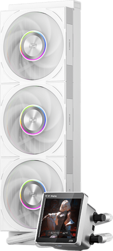 Система охлаждения PCCooler DT360 ARGB представлена в белом цвете. Водоблок оснащен встроенным цветным дисплеем. Три вентилятора 120x120 мм с полупрозрачными белыми лопастями равномерно распределяют свет от ARGB-светодиодов и создают эффектное освещение.