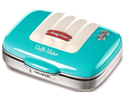 Прибор для приготовления вафель ARIETE 1973/01 PARTY TIME. Вафельница выполненная в ретро-стиле позволяет испечь одновременно пару пышных венских вафель квадратной формы за пару минут. Классический рецепт: 300 гр. муки, 10 г. разрыхлителя, 75 г. сахарной пудры, 100 г. сливочного масла, 2 яйца, 0.5 молока.