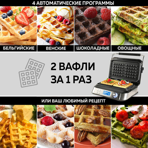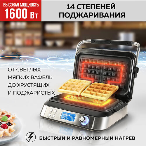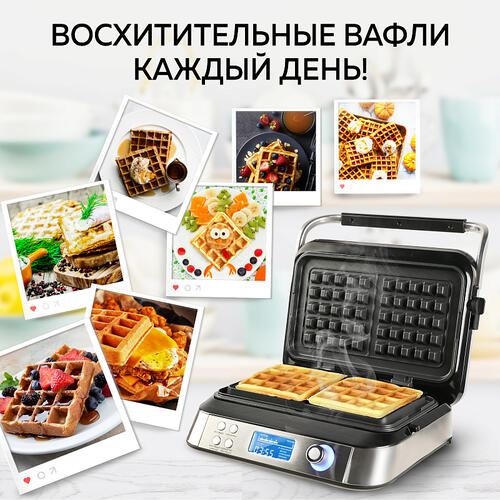 Электровафельница GFW-050 предназначена для приготовления вкусных ароматных вафель на любой вкус - венских, бельгийских, овощных, диетических и шоколадных. Электро вафельница GFW-050 с антипригарным покрытием это - Универсальность 5 Программ: 4 автоматические программы (Бельгийские вафли, Венские вафли, Шоколадные вафли, Овощные вафли) и программа «Ваш рецепт», где можно самостоятельно контролировать время и поджарку вафель; 2 текстуры вафли на выбор (хрустящая снаружи и мягкая внутри или полностью хрустящая вафля); 7 Степеней поджаривания вафли на выбор (от светлой корочки до тёмной); Технологичность Высокая мощность 1600 Вт и двусторонний нагрев панелей обеспечивают быстрый нагрев вафельницы, а также равномерное приготовление вафель; интеллектуальный таймер после выбора автопрограммы, текстуры и степени поджаривания автоматически определит время приготовления и, исходя из установленных настроек, запустит обратный отсчет; Русифицированный ЖК-Дисплей отображает выбранную программу, текстуру, степень поджаривания и время. Стиль Благодаря эргономичному дизайну и металлическому корпусу электровафельница GFW-050 станет украшением и стильным акцентом на любой кухне; простота в уходе: антипригарное покрытие панелей и их продуманная конструкция обеспечивают легкий уход за вафельницей; компактность: благодаря оптимальным размерам (32,0*29,0*16,5 см) вафельница GFW-050 не займет много места на кухне. За счет наличия защелки-фиксатора вафельницу GFW-050 можно хранить вертикально; экологически чистые, безопасные и качественные материалы. Готовить вафли при помощи вафельницы GFW-050 просто - нужно подключить прибор к сети, выбрать нужную автопрограмму, текстуру вафли и степень поджаривания, дождаться оптимального нагрева, о чем подскажет звуковой сигнал, затем поместить порцию теста в вафельницу, закрыть крышку и уже через несколько минут достать готовые вафли. Вафельница GFW-050 станет Вашей незаменимой помощницей в приготовлении вкусных вафель и отличным подарком для друзей и родственников, которые ценят настоящую домашнюю выпечку!