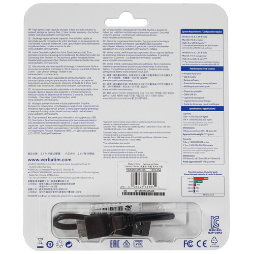 Внешний HDD Verbatim Store "n" Go [53195] станет надежным помощником для хранения документов и мультимедийного контента (фотографии, аудиофайлы, видеоматериал). Он выполнен в прочном пластиковом корпусе компактного размера, устойчивом к появлению царапин и дефектов в результате негативных воздействий. Портативный накопитель характеризуется вместимостью 2 ТБ и простым подключением посредством интерфейсного порта USB 3.2 Gen 1 Type A. Кабель синхронизации USB позволяет подключать хранилище к различному совместимому оборудованию без дополнительного программного обеспечения. В комплекте с накопителем Verbatim Store "n" Go [53195] предусмотрен кабель USB.