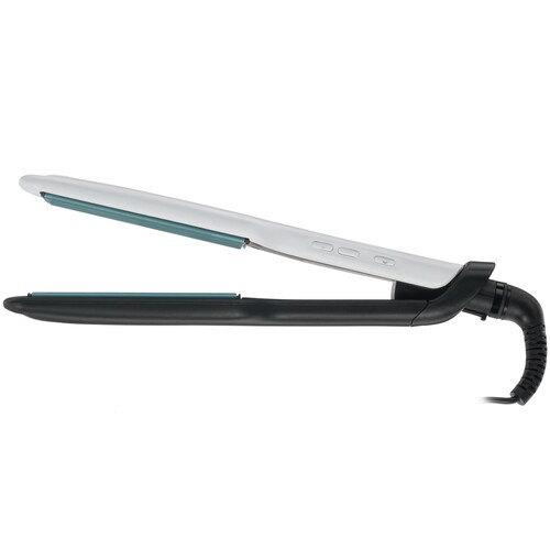 Выпрямитель для волос Remington S8550 обладает традиционным для такого типа устройств черно-белым корпусом. Широкие плавающие пластины оснащены керамическим покрытием, которое способствует сохранению здоровья волос даже при регулярных укладках. Температура их нагрева варьируется в 10 режимах в температурном диапазоне от 150 до 235°. Все эти факторы означают, что устройство способно создать идеальные условия для выпрямления локонов любого типа. Температура нагрева пластин отображается на дисплее, расположенном на лицевой стороне корпуса. Блокировка кнопок и фиксатор складывания делают конструкцию выпрямителя для волос Remington S8550 удобной в поездках и при хранении дома. Еще одно преимущество модели – ее длинный 2.5-метровый шнур, за счет которого с утюжком в руках можно с удобством устроиться у зеркала.