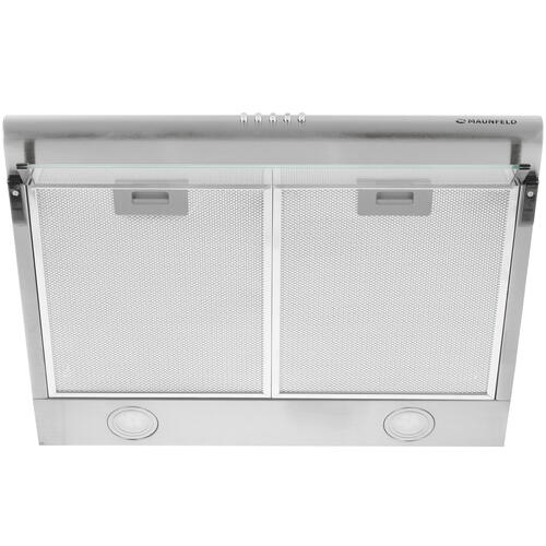 Вытяжка подвесная MAUNFELD MP-1 60 серебристого цвета обладает лаконичным металлическим корпусом, позволяющим ей гармонично вписаться в кухонное пространство. Благодаря довольно мощному мотору (100 Вт) вытяжка эффективно справляется с очищением воздуха на кухнях до 12 м². При работе на максимальной скорости производительность вытяжки составляет 520 м³/ч, а уровень шума всего 49 дБ. Всего у вытяжки 3 рабочих скорости, которые можно переключать с помощью кнопочной панели. Вытяжка подвесная MAUNFELD MP-1 60 оснащена многослойным жировым фильтром, способным улавливать копоть и жир, не позволяя им оседать на кухонной мебели. Если планируется включать вытяжку только в режиме циркуляции, то можно дополнительно установить угольный фильтр. Для режима отвода в корпусе вытяжки предусмотрен воздуховод диаметром 120 мм. Дополняют функционал вытяжки две светодиодные лампы, с помощью которых хорошо освещается варочная поверхность, а также создается более уютная атмосфера на кухне.